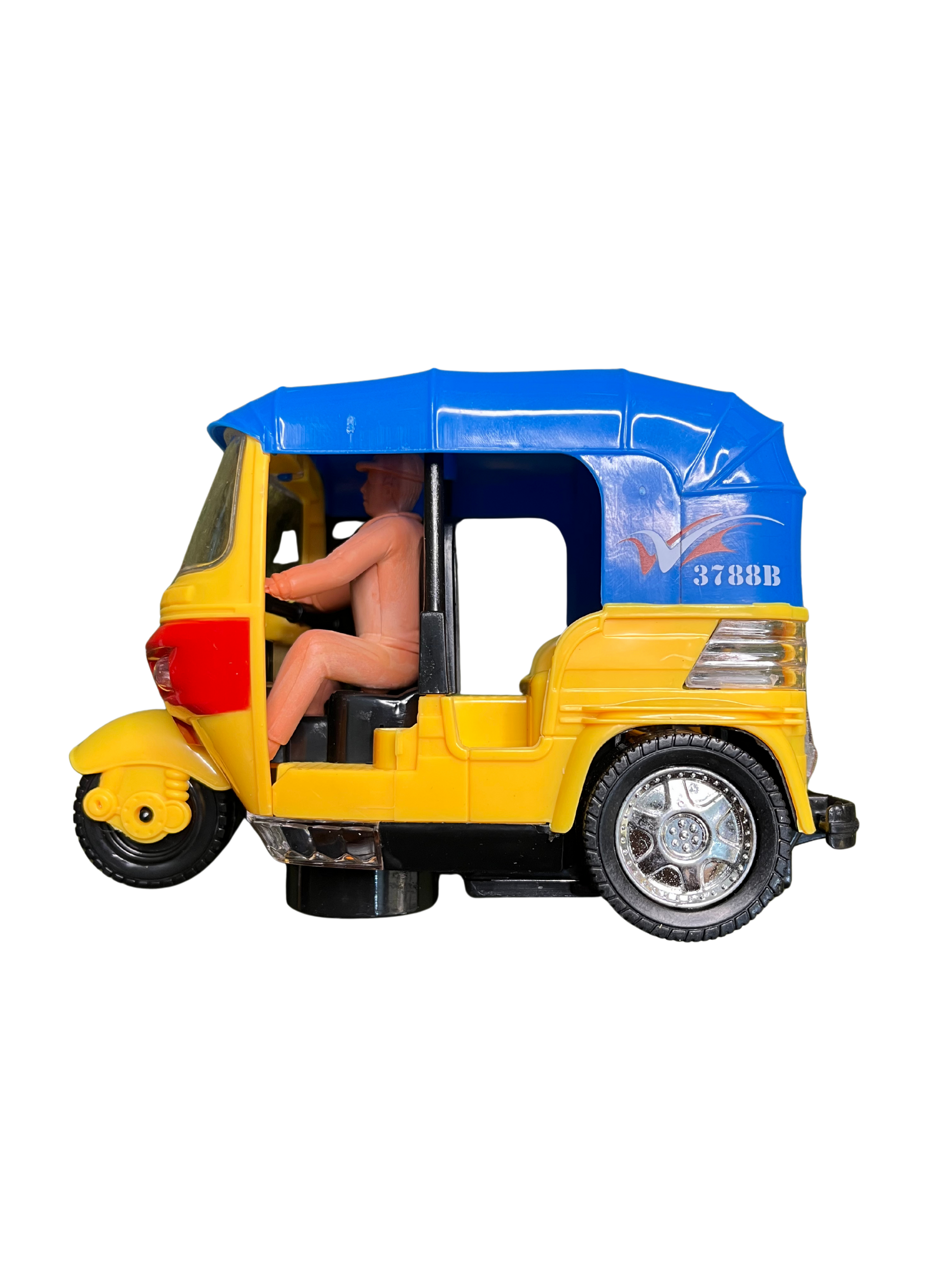 • Exciting auto rickshaw tricycle toy with pull-back action and bump & go feature